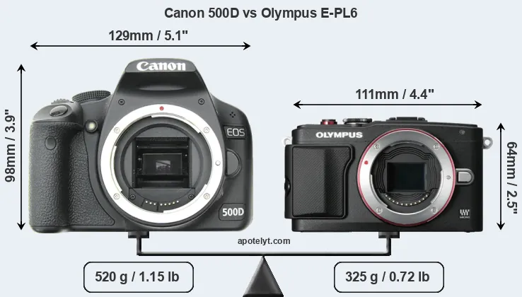 The side-by-side display below illustrates the physical size and weight of the Canon 500D and the Olympus E-PL6. The two cameras are presented according to their relative size. Three successive views from the front, the top, and the rear are shown. All width, height and depth measures are rounded to the nearest millimeter.