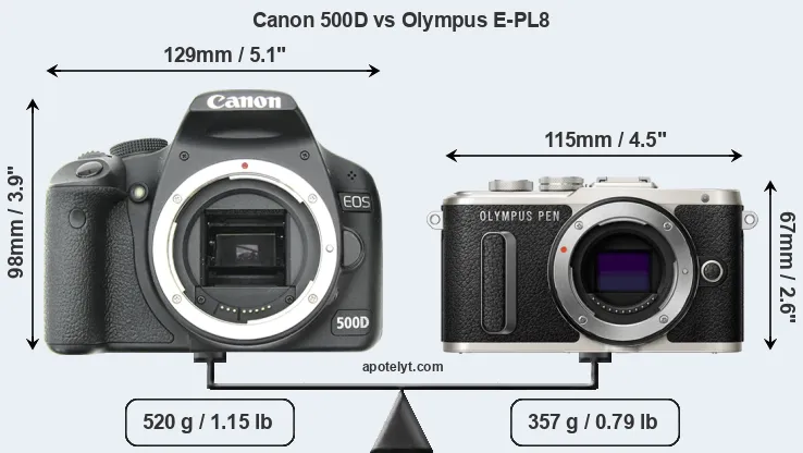 If the front view area (width x height) of the cameras is taken as an aggregate measure of their size, the Olympus E-PL8 is considerably smaller (39 percent) than the Canon 500D. Moreover, the E-PL8 is markedly lighter (31 percent) than the 500D. In this context, it is worth noting that neither the 500D nor the E-PL8 are weather-sealed.