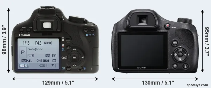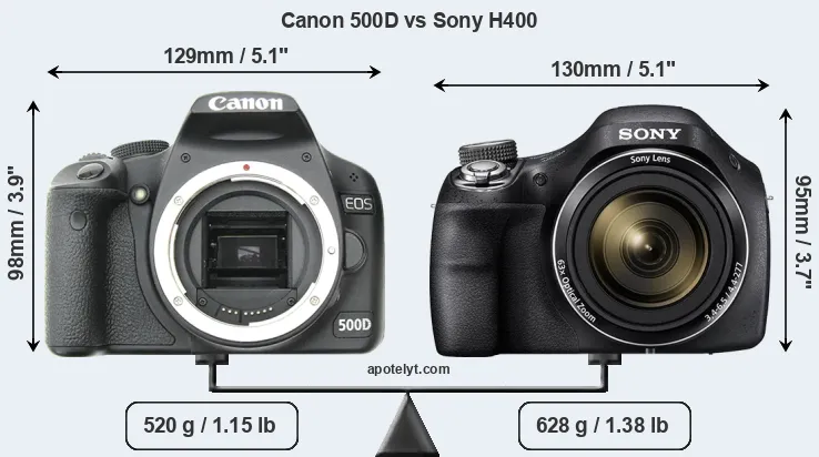 The side-by-side display below illustrates the physical size and weight of the Canon 500D and the Sony H400. The two cameras are presented according to their relative size. Three consecutive perspectives from the front, the top, and the back are available. All width, height and depth measures are rounded to the nearest millimeter.