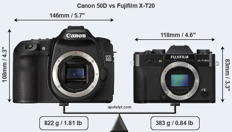 If the front view area (width x height) of the cameras is taken as an aggregate measure of their size, the Fujifilm X-T20 is considerably smaller (38 percent) than the Canon 50D. Moreover, the X-T20 is substantially lighter (53 percent) than the 50D. It is worth mentioning in this context that the 50D is splash and dust resistant, while the X-T20 does not feature any corresponding weather-sealing.