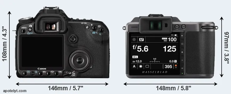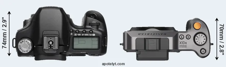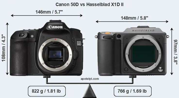 The physical size and weight of the Canon 50D and the Hasselblad X1D II are illustrated in the side-by-side display below. The two cameras are presented according to their relative size. Three consecutive perspectives from the front, the top, and the back are available. All width, height and depth dimensions are rounded to the nearest millimeter.