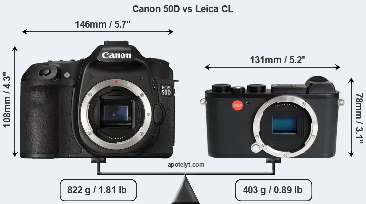 If the front view area (width x height) of the cameras is taken as an aggregate measure of their size, the Leica CL is considerably smaller (35 percent) than the Canon 50D. Moreover, the CL is substantially lighter (51 percent) than the 50D. It is worth mentioning in this context that the 50D is splash and dust resistant, while the CL does not feature any corresponding weather-sealing.
