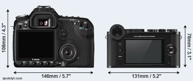 The physical size and weight of the Canon 50D and the Leica CL are illustrated in the side-by-side display below. The two cameras are presented according to their relative size. Three consecutive views from the front, the top, and the rear side are shown. All width, height and depth measures are rounded to the nearest millimeter.