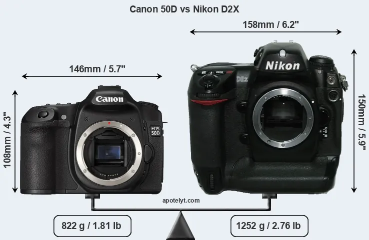 An illustration of the physical size and weight of the Canon 50D and the Nikon D2X is provided in the side-by-side display below. The two cameras are presented according to their relative size. Three consecutive views from the front, the top, and the rear side are shown. All width, height and depth dimensions are rounded to the nearest millimeter.
