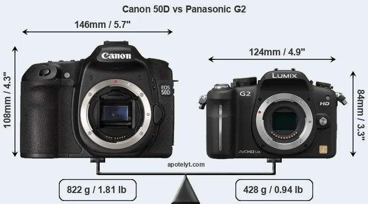 The physical size and weight of the Canon 50D and the Panasonic G2 are illustrated in the side-by-side display below. The two cameras are presented according to their relative size. Three consecutive perspectives from the front, the top, and the back are available. All width, height and depth dimensions are rounded to the nearest millimeter.