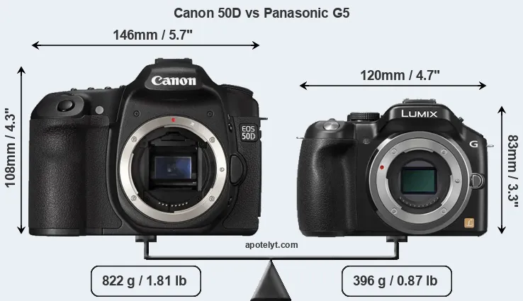 An illustration of the physical size and weight of the Canon 50D and the Panasonic G5 is provided in the side-by-side display below. The two cameras are presented according to their relative size. Three consecutive perspectives from the front, the top, and the back are available. All width, height and depth dimensions are rounded to the nearest millimeter.