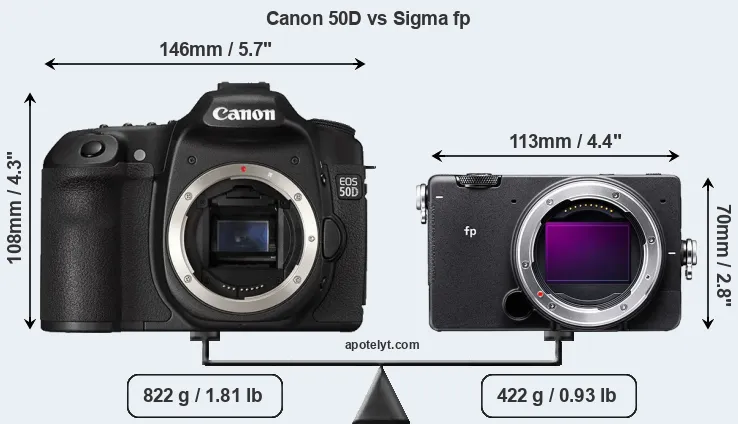 The physical size and weight of the Canon 50D and the Sigma fp are illustrated in the side-by-side display below. The two cameras are presented according to their relative size. Three successive views from the front, the top, and the rear are shown. All width, height and depth dimensions are rounded to the nearest millimeter.