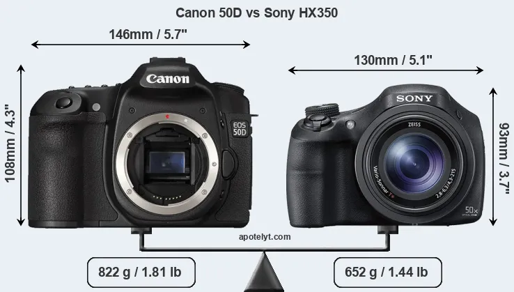The physical size and weight of the Canon 50D and the Sony HX350 are illustrated in the side-by-side display below. The two cameras are presented according to their relative size. Three successive views from the front, the top, and the rear are shown. All width, height and depth dimensions are rounded to the nearest millimeter.