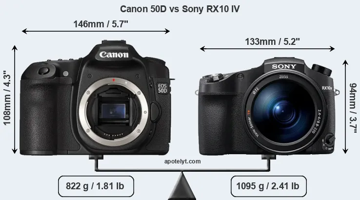 The above size and weight comparisons are to some extent incomplete and possibly misleading, as the RX10 IV has a lens built in, whereas the 50D is an interchangeable lens camera that requires a separate lens. Attaching the latter will add extra weight and bulk to the setup. You can compare the optics available for the 50D and their specifications in the Canon EF Lens Catalog.
