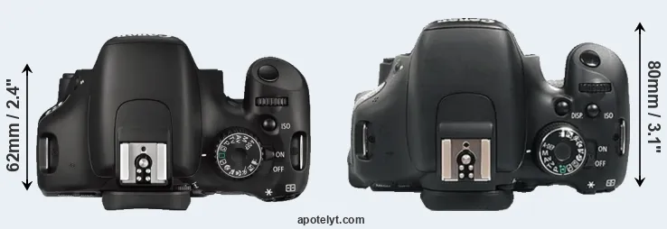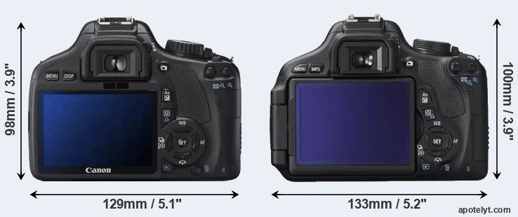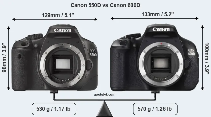 An illustration of the physical size and weight of the Canon 550D and the Canon 600D is provided in the side-by-side display below. The two cameras are presented according to their relative size. Three consecutive views from the front, the top, and the rear side are shown. All width, height and depth dimensions are rounded to the nearest millimeter.