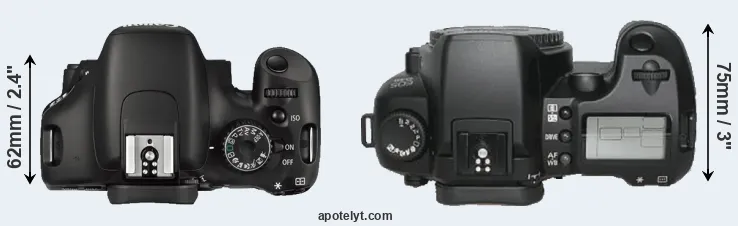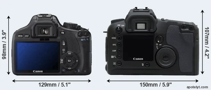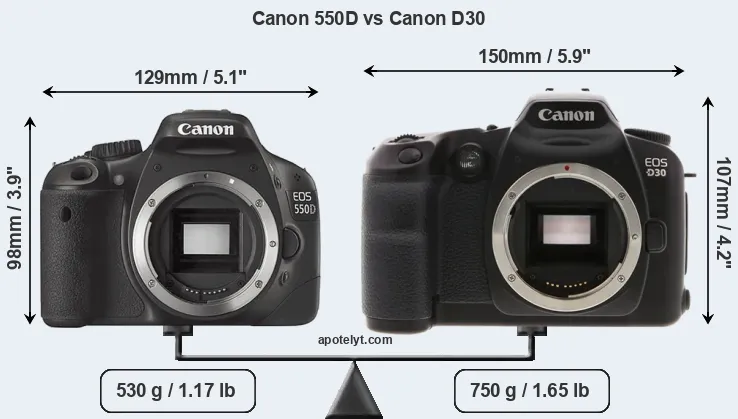 The physical size and weight of the Canon 550D and the Canon D30 are illustrated in the side-by-side display below. The two cameras are presented according to their relative size. Three consecutive perspectives from the front, the top, and the back are available. All width, height and depth dimensions are rounded to the nearest millimeter.