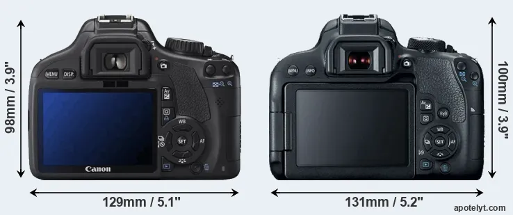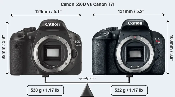 An illustration of the physical size and weight of the Canon 550D and the Canon T7i is provided in the side-by-side display below. The two cameras are presented according to their relative size. Three successive views from the front, the top, and the rear are shown. All width, height and depth dimensions are rounded to the nearest millimeter.
