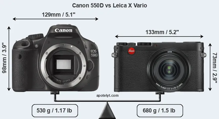 The physical size and weight of the Canon 550D and the Leica X Vario are illustrated in the side-by-side display below. The two cameras are presented according to their relative size. Three consecutive perspectives from the front, the top, and the back are available. All width, height and depth dimensions are rounded to the nearest millimeter.