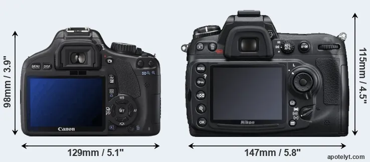 The physical size and weight of the Canon 550D and the Nikon D300S are illustrated in the side-by-side display below. The two cameras are presented according to their relative size. Three consecutive views from the front, the top, and the rear side are shown. All width, height and depth measures are rounded to the nearest millimeter.