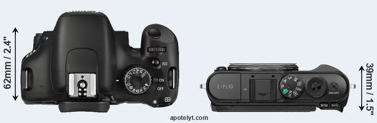 The side-by-side display below illustrates the physical size and weight of the Canon 550D and the Olympus E-PL10. The two cameras are presented according to their relative size. Three consecutive views from the front, the top, and the rear side are shown. All size dimensions are rounded to the nearest millimeter.