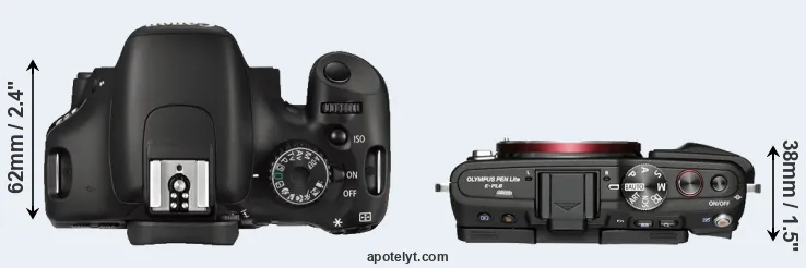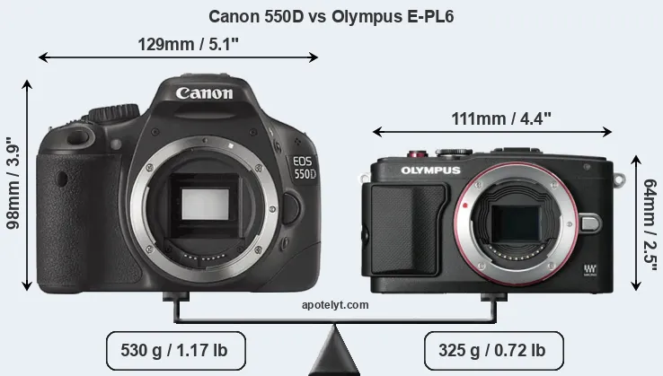 The physical size and weight of the Canon 550D and the Olympus E-PL6 are illustrated in the side-by-side display below. The two cameras are presented according to their relative size. Three successive views from the front, the top, and the rear are shown. All width, height and depth dimensions are rounded to the nearest millimeter.