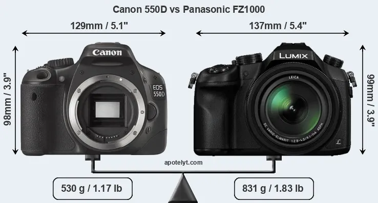 The above size and weight comparisons are to some extent incomplete and possibly misleading, as the FZ1000 has a lens built in, whereas the 550D is an interchangeable lens camera that requires a separate lens. Attaching the latter will add extra weight and bulk to the setup. You can compare the optics available for the 550D and their specifications in the Canon EF Lens Catalog.