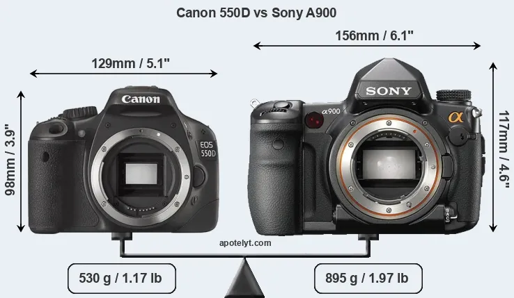 The physical size and weight of the Canon 550D and the Sony A900 are illustrated in the side-by-side display below. The two cameras are presented according to their relative size. Three successive views from the front, the top, and the rear are shown. All width, height and depth measures are rounded to the nearest millimeter.