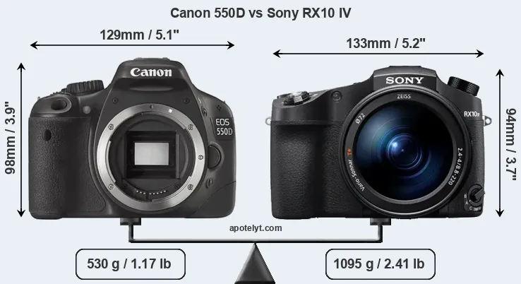 The above size and weight comparisons are to some extent incomplete and possibly misleading, as the RX10 IV has a lens built in, whereas the 550D is an interchangeable lens camera that requires a separate lens. Attaching the latter will add extra weight and bulk to the setup. You can compare the optics available for the 550D and their specifications in the Canon EF Lens Catalog.