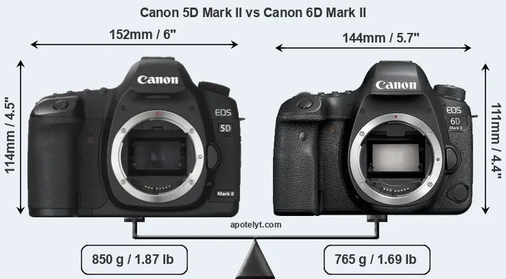 The side-by-side display below illustrates the physical size and weight of the Canon 5D Mark II and the Canon 6D Mark II. The two cameras are presented according to their relative size. Three consecutive perspectives from the front, the top, and the back are available. All size dimensions are rounded to the nearest millimeter.