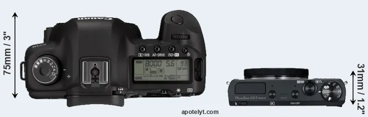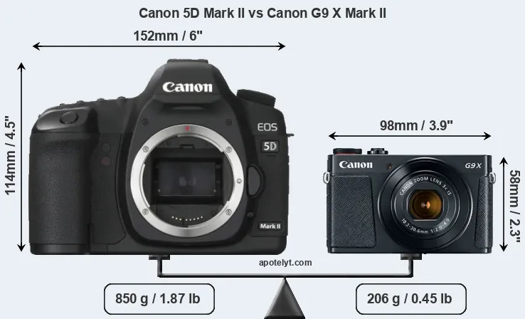 The side-by-side display below illustrates the physical size and weight of the Canon 5D Mark II and the Canon G9 X Mark II. The two cameras are presented according to their relative size. Three successive views from the front, the top, and the rear are shown. All width, height and depth dimensions are rounded to the nearest millimeter.