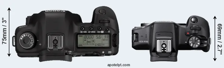 The side-by-side display below illustrates the physical size and weight of the Canon 5D Mark II and the Canon R100. The two cameras are presented according to their relative size. Three successive views from the front, the top, and the rear are shown. All size dimensions are rounded to the nearest millimeter.