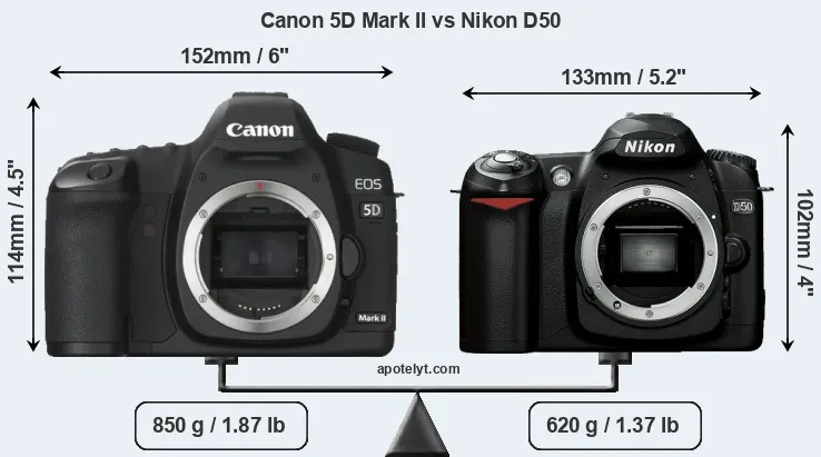 An illustration of the physical size and weight of the Canon 5D Mark II and the Nikon D50 is provided in the side-by-side display below. The two cameras are presented according to their relative size. Three consecutive views from the front, the top, and the rear side are shown. All width, height and depth measures are rounded to the nearest millimeter.
