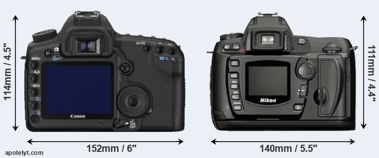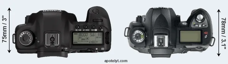 The physical size and weight of the Canon 5D Mark II and the Nikon D70 are illustrated in the side-by-side display below. The two cameras are presented according to their relative size. Three consecutive perspectives from the front, the top, and the back are available. All size dimensions are rounded to the nearest millimeter.