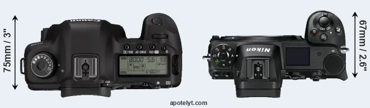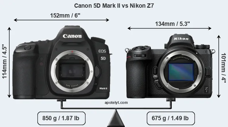 An illustration of the physical size and weight of the Canon 5D Mark II and the Nikon Z7 is provided in the side-by-side display below. The two cameras are presented according to their relative size. Three consecutive perspectives from the front, the top, and the back are available. All size dimensions are rounded to the nearest millimeter.