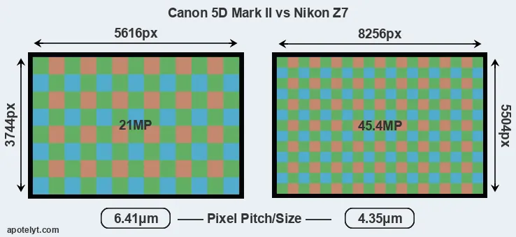 Despite having a slightly smaller sensor, the Z7 offers a higher resolution of 45.4 megapixels, compared with 21 MP of the 5D Mark II. This megapixels advantage comes at the cost of a higher pixel density and a smaller size of the individual pixel (with a pixel pitch of 4.35μm versus 6.41μm for the 5D Mark II). However, it should be noted that the Z7 is much more recent (by 9 years and 11 months) than the 5D Mark II, and its sensor will have benefitted from technological advances during this time that make it possible to gather light more efficiently. Coming back to sensor resolution, it should be mentioned that the Z7 has no anti-alias filter installed, so that it can capture all the detail its sensor resolves.