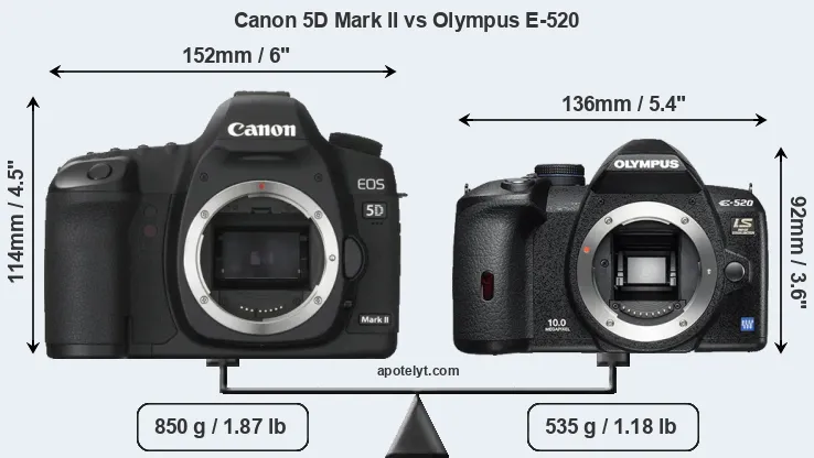 The side-by-side display below illustrates the physical size and weight of the Canon 5D Mark II and the Olympus E-520. The two cameras are presented according to their relative size. Three successive views from the front, the top, and the rear are shown. All width, height and depth dimensions are rounded to the nearest millimeter.