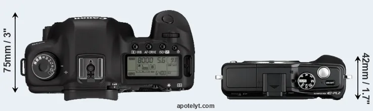 An illustration of the physical size and weight of the Canon 5D Mark II and the Olympus E-PL2 is provided in the side-by-side display below. The two cameras are presented according to their relative size. Three successive views from the front, the top, and the rear are shown. All width, height and depth dimensions are rounded to the nearest millimeter.