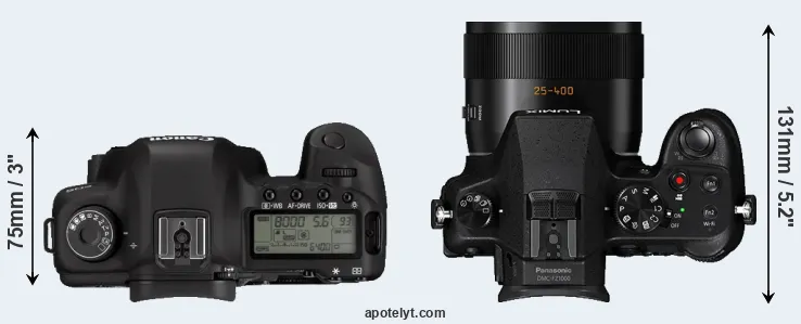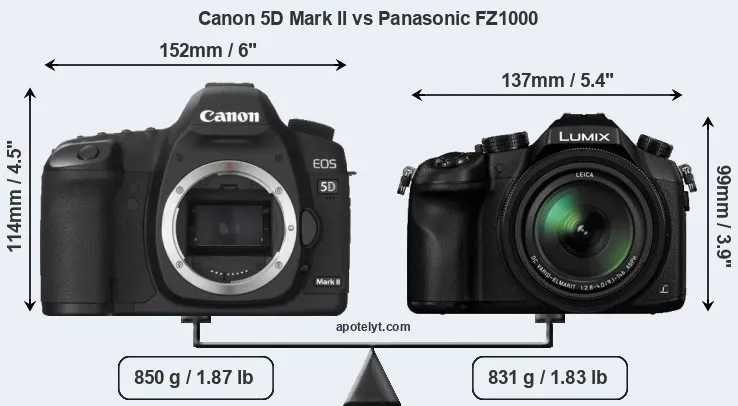 The physical size and weight of the Canon 5D Mark II and the Panasonic FZ1000 are illustrated in the side-by-side display below. The two cameras are presented according to their relative size. Three consecutive views from the front, the top, and the rear side are shown. All width, height and depth dimensions are rounded to the nearest millimeter.