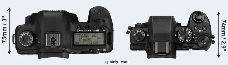 The side-by-side display below illustrates the physical size and weight of the Canon 5D Mark II and the Panasonic G80. The two cameras are presented according to their relative size. Three consecutive views from the front, the top, and the rear side are shown. All size dimensions are rounded to the nearest millimeter.