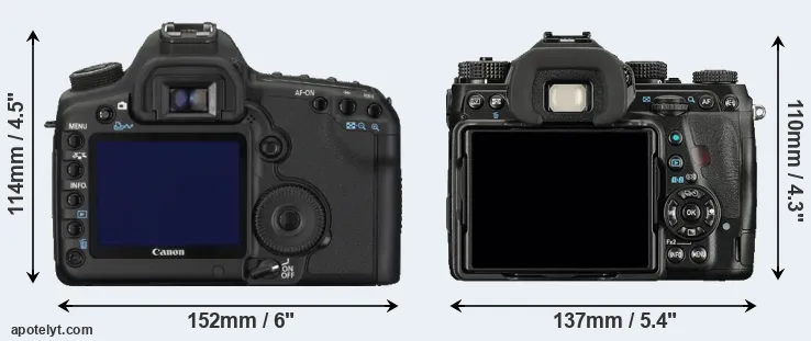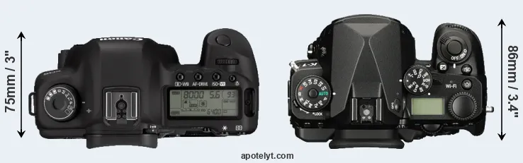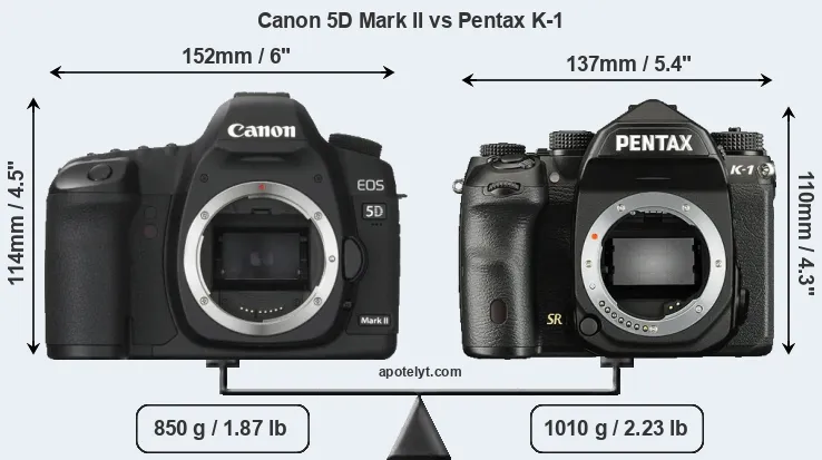 The physical size and weight of the Canon 5D Mark II and the Pentax K-1 are illustrated in the side-by-side display below. The two cameras are presented according to their relative size. Three consecutive perspectives from the front, the top, and the back are available. All width, height and depth measures are rounded to the nearest millimeter.