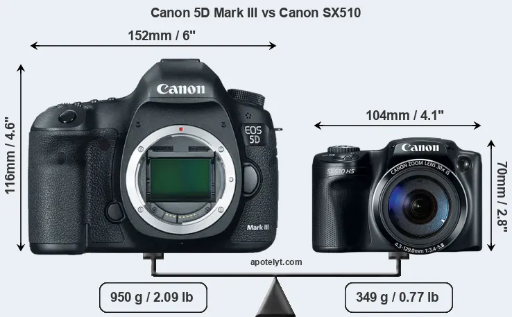The physical size and weight of the Canon 5D Mark III and the Canon SX510 are illustrated in the side-by-side display below. The two cameras are presented according to their relative size. Three consecutive views from the front, the top, and the rear side are shown. All width, height and depth measures are rounded to the nearest millimeter.