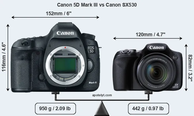 An illustration of the physical size and weight of the Canon 5D Mark III and the Canon SX530 is provided in the side-by-side display below. The two cameras are presented according to their relative size. Three successive views from the front, the top, and the rear are shown. All width, height and depth dimensions are rounded to the nearest millimeter.