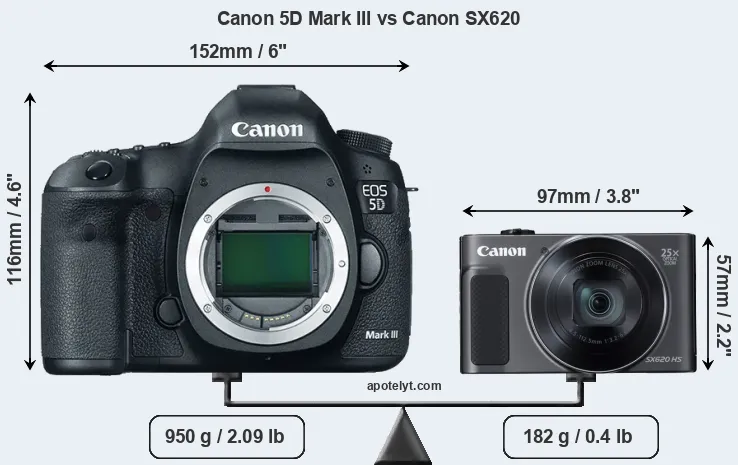 An illustration of the physical size and weight of the Canon 5D Mark III and the Canon SX620 is provided in the side-by-side display below. The two cameras are presented according to their relative size. Three consecutive perspectives from the front, the top, and the back are available. All width, height and depth dimensions are rounded to the nearest millimeter.
