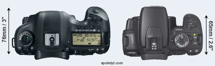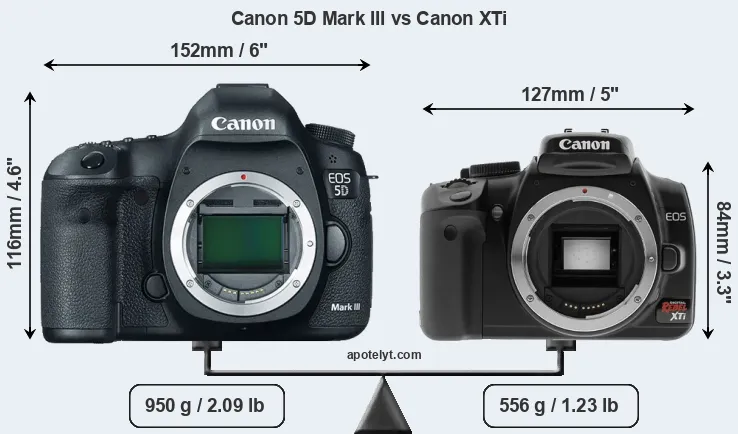 An illustration of the physical size and weight of the Canon 5D Mark III and the Canon XTi is provided in the side-by-side display below. The two cameras are presented according to their relative size. Three consecutive views from the front, the top, and the rear side are shown. All size dimensions are rounded to the nearest millimeter.
