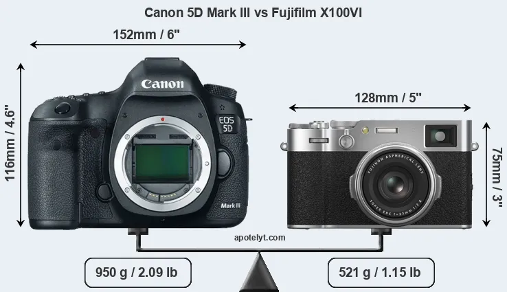 The side-by-side display below illustrates the physical size and weight of the Canon 5D Mark III and the Fujifilm X100VI. The two cameras are presented according to their relative size. Three consecutive perspectives from the front, the top, and the back are available. All width, height and depth measures are rounded to the nearest millimeter.