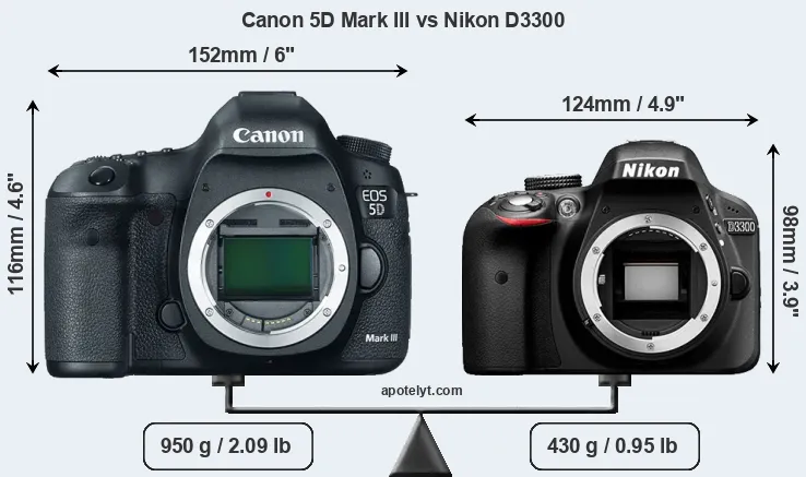 An illustration of the physical size and weight of the Canon 5D Mark III and the Nikon D3300 is provided in the side-by-side display below. The two cameras are presented according to their relative size. Three consecutive views from the front, the top, and the rear side are shown. All width, height and depth measures are rounded to the nearest millimeter.