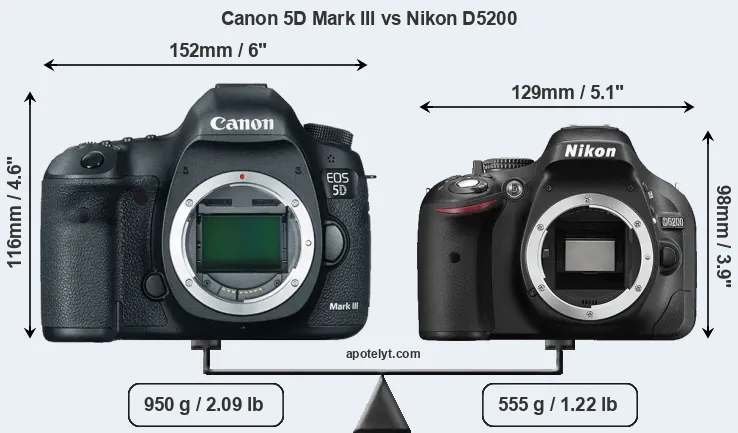 An illustration of the physical size and weight of the Canon 5D Mark III and the Nikon D5200 is provided in the side-by-side display below. The two cameras are presented according to their relative size. Three consecutive views from the front, the top, and the rear side are shown. All width, height and depth measures are rounded to the nearest millimeter.