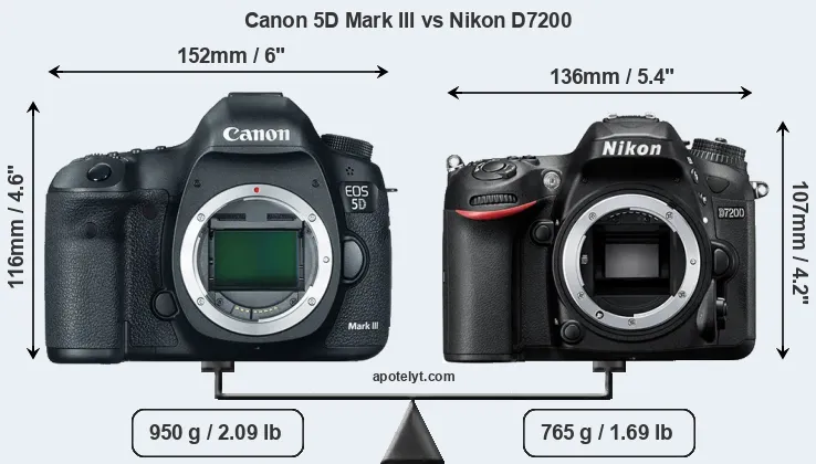 If the front view area (width x height) of the cameras is taken as an aggregate measure of their size, the Nikon D7200 is notably smaller (17 percent) than the Canon 5D Mark III. Moreover, the D7200 is markedly lighter (19 percent) than the 5D Mark III. In this context, it is worth noting that both cameras are splash and dust-proof and can, hence, be used in inclement weather conditions or harsh environments.