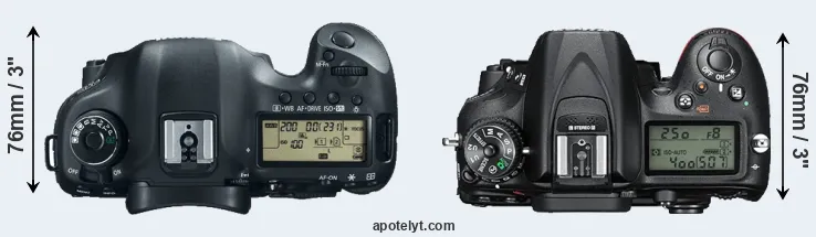 The side-by-side display below illustrates the physical size and weight of the Canon 5D Mark III and the Nikon D7200. The two cameras are presented according to their relative size. Three consecutive views from the front, the top, and the rear side are shown. All size dimensions are rounded to the nearest millimeter.