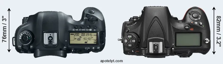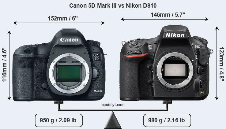 The side-by-side display below illustrates the physical size and weight of the Canon 5D Mark III and the Nikon D810. The two cameras are presented according to their relative size. Three consecutive views from the front, the top, and the rear side are shown. All width, height and depth dimensions are rounded to the nearest millimeter.