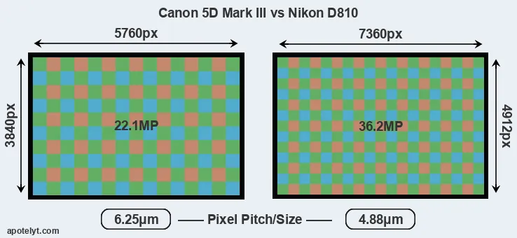 Despite having a slightly smaller sensor, the D810 offers a higher resolution of 36.2 megapixels, compared with 22.1 MP of the 5D Mark III. This megapixels advantage comes at the cost of a higher pixel density and a smaller size of the individual pixel (with a pixel pitch of 4.88μm versus 6.25μm for the 5D Mark III). However, it should be noted that the D810 is much more recent (by 2 years and 3 months) than the 5D Mark III, and its sensor will have benefitted from technological advances during this time that make it possible to gather light more efficiently. Coming back to sensor resolution, it should be mentioned that the D810 has no anti-alias filter installed, so that it can capture all the detail its sensor resolves.