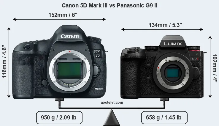 An illustration of the physical size and weight of the Canon 5D Mark III and the Panasonic G9 II is provided in the side-by-side display below. The two cameras are presented according to their relative size. Three consecutive views from the front, the top, and the rear side are shown. All width, height and depth measures are rounded to the nearest millimeter.
