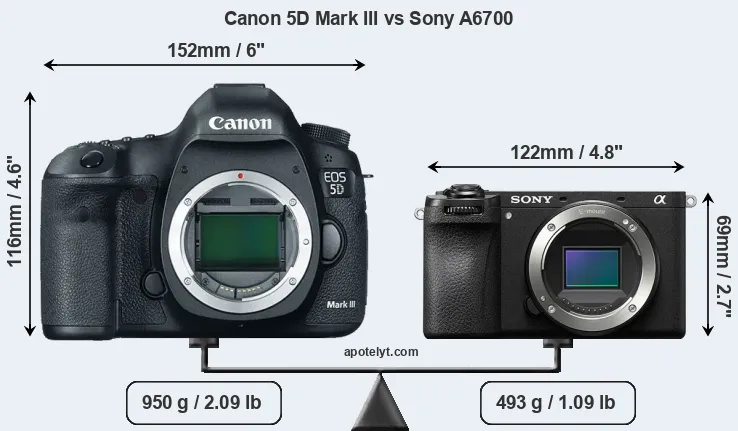 The side-by-side display below illustrates the physical size and weight of the Canon 5D Mark III and the Sony A6700. The two cameras are presented according to their relative size. Three successive views from the front, the top, and the rear are shown. All width, height and depth measures are rounded to the nearest millimeter.