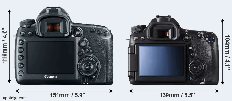 The side-by-side display below illustrates the physical size and weight of the Canon 5D Mark IV and the Canon 70D. The two cameras are presented according to their relative size. Three consecutive perspectives from the front, the top, and the back are available. All width, height and depth measures are rounded to the nearest millimeter.