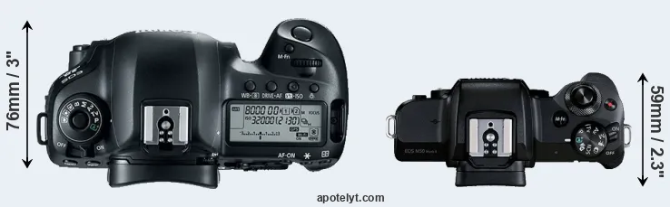 The side-by-side display below illustrates the physical size and weight of the Canon 5D Mark IV and the Canon M50 Mark II. The two cameras are presented according to their relative size. Three consecutive views from the front, the top, and the rear side are shown. All width, height and depth dimensions are rounded to the nearest millimeter.